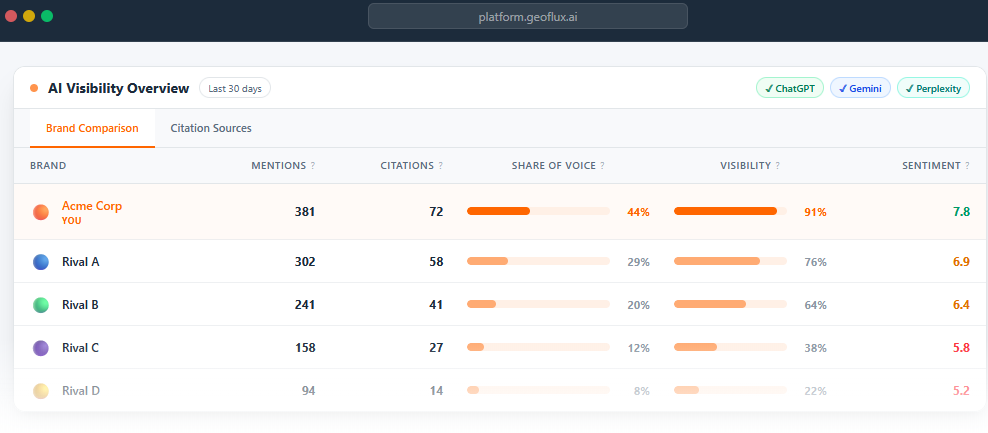 În loc să urmărească keyword-uri și trafic web, GEOflux monitorizează conversații, mențiuni și surse citate. În loc de click-through rate, platforma măsoară Share of Voice în răspunsurile AI.