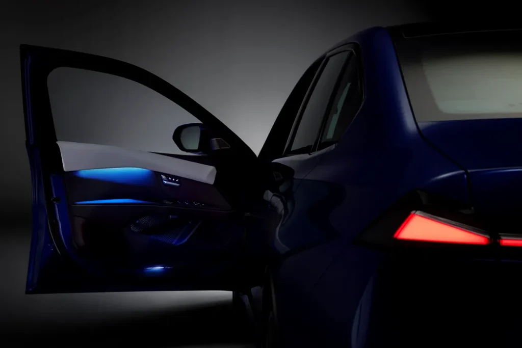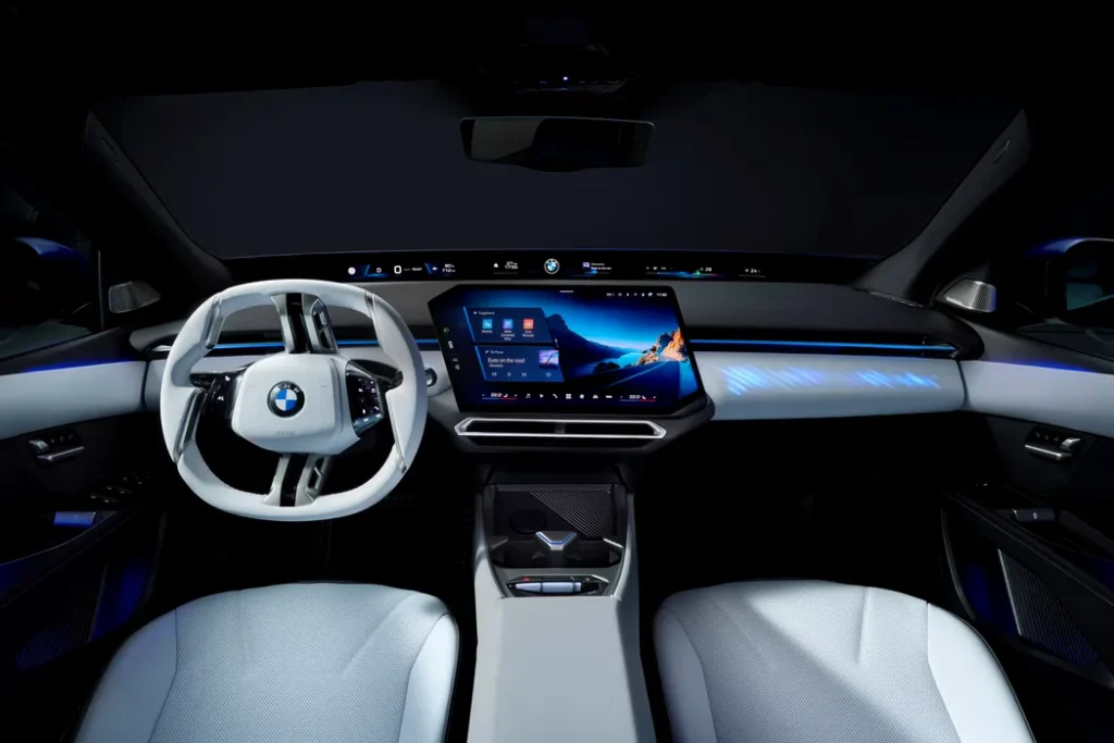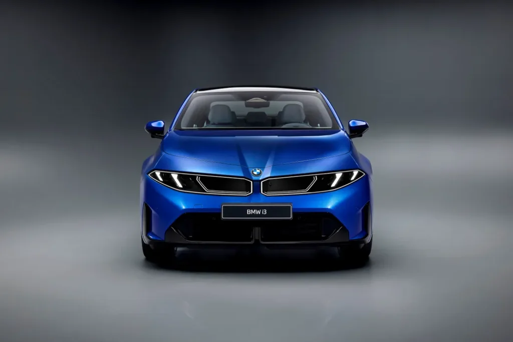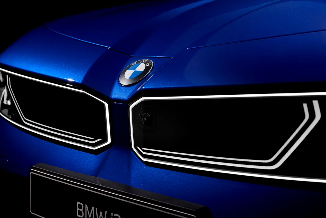 Fața mașinii păstrează elemente familiare, dar le duce într-o zonă mai minimalistă. Grila tip „rinichi” nu mai este clasică – este integrată într-un panou transparent, iluminat, iar în spatele ei sunt ascunși senzorii și radarele.