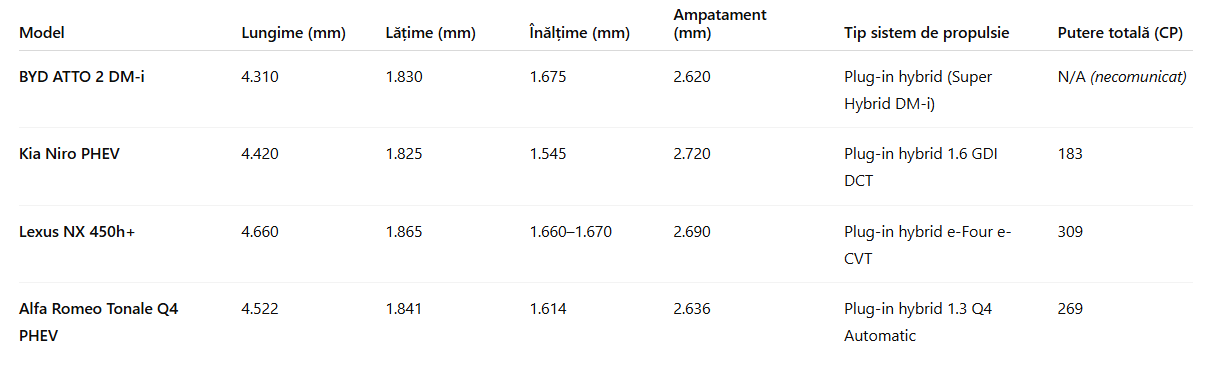 Deși dimensiunile îl plasează în zona SUV-urilor compacte, noul BYD ATTO 2 DM-i se va confrunta direct cu modele plug-in hybrid consacrate din Europa și Asia, precum Kia Niro PHEV, Lexus NX 450h+ și Alfa Romeo Tonale Q4 PHEV.