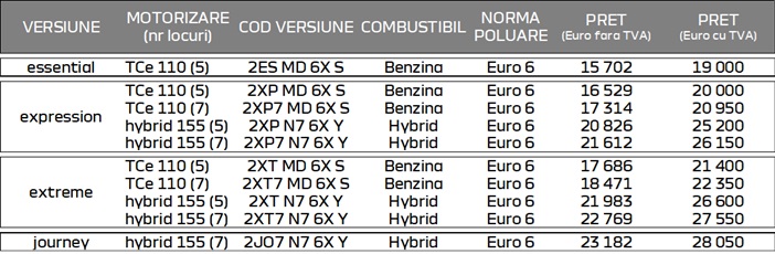 Versiunea de bază, Essential TCe 110, are un preț de pornire de 19.000 de euro (TVA inclus). La polul opus se află Journey Hybrid 155, versiunea complet echipată, disponibilă la 28.050 de euro (TVA inclus).