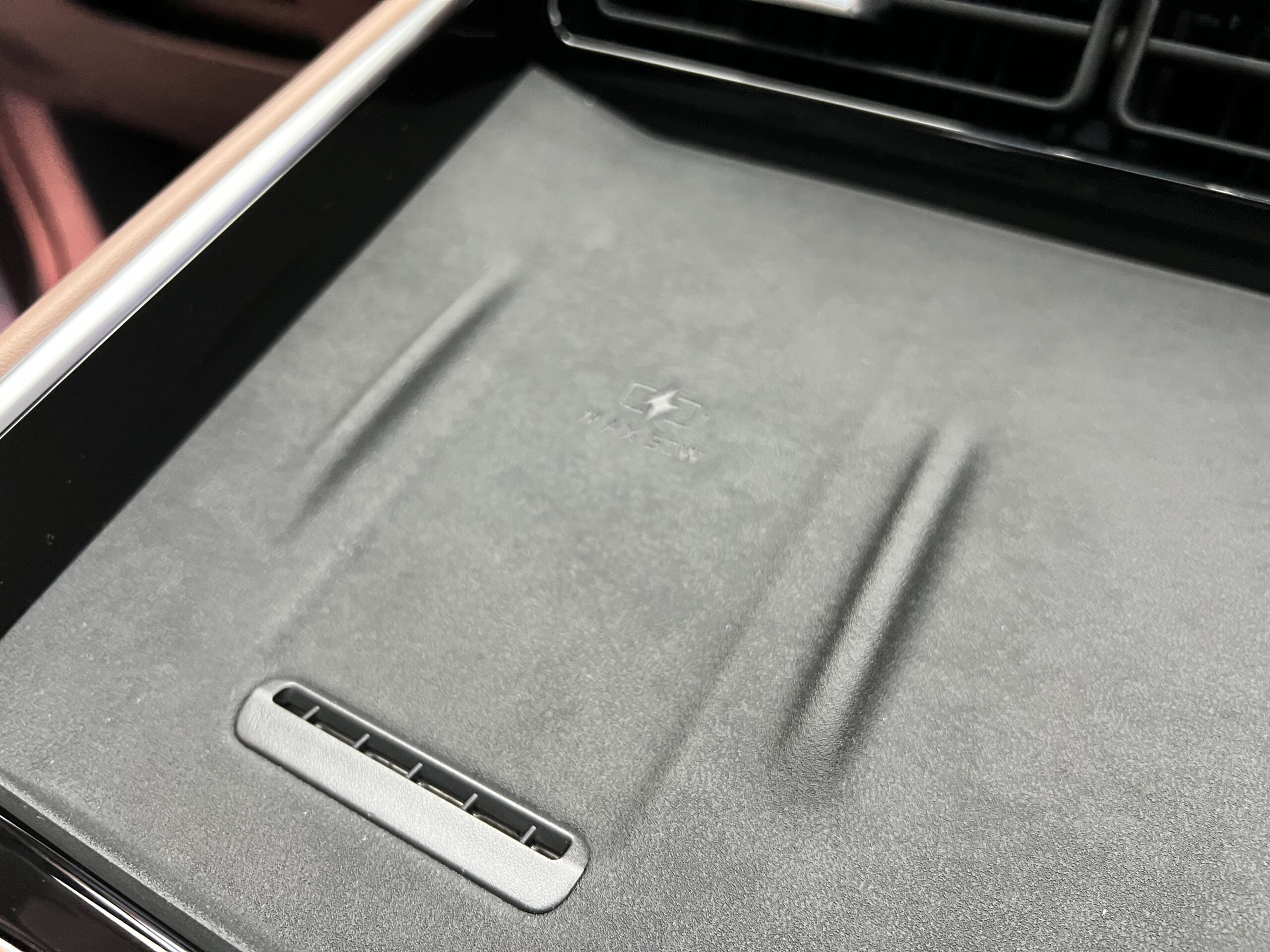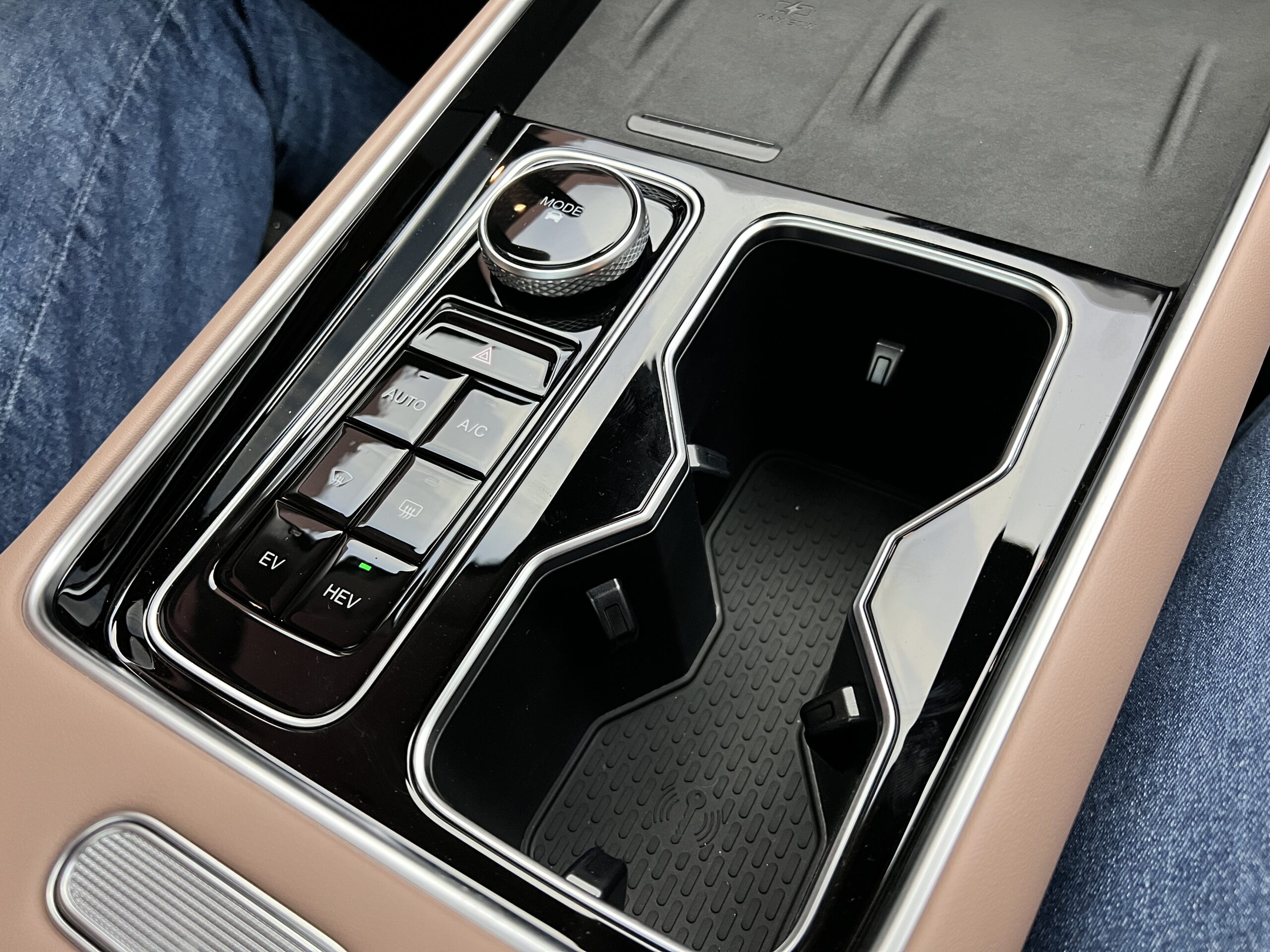 Sub ecranul central avem gurile de ventilație, iar sub acestea se află un încărcător wireless de până la 50 W. O adiție interesantă și binevenită, pe care toți producătorii auto ar trebui să o aibă, este o gură de ventilație pentru a răci telefonul cât se află la încărcat. Din consola centrală putem controla modurile de condus, șapte la număr, elemente de bază ale climatizării, dar și modurile de rulare a sistemului de propulsie, despre care vom vorbi în detaliu puțin mai încolo.