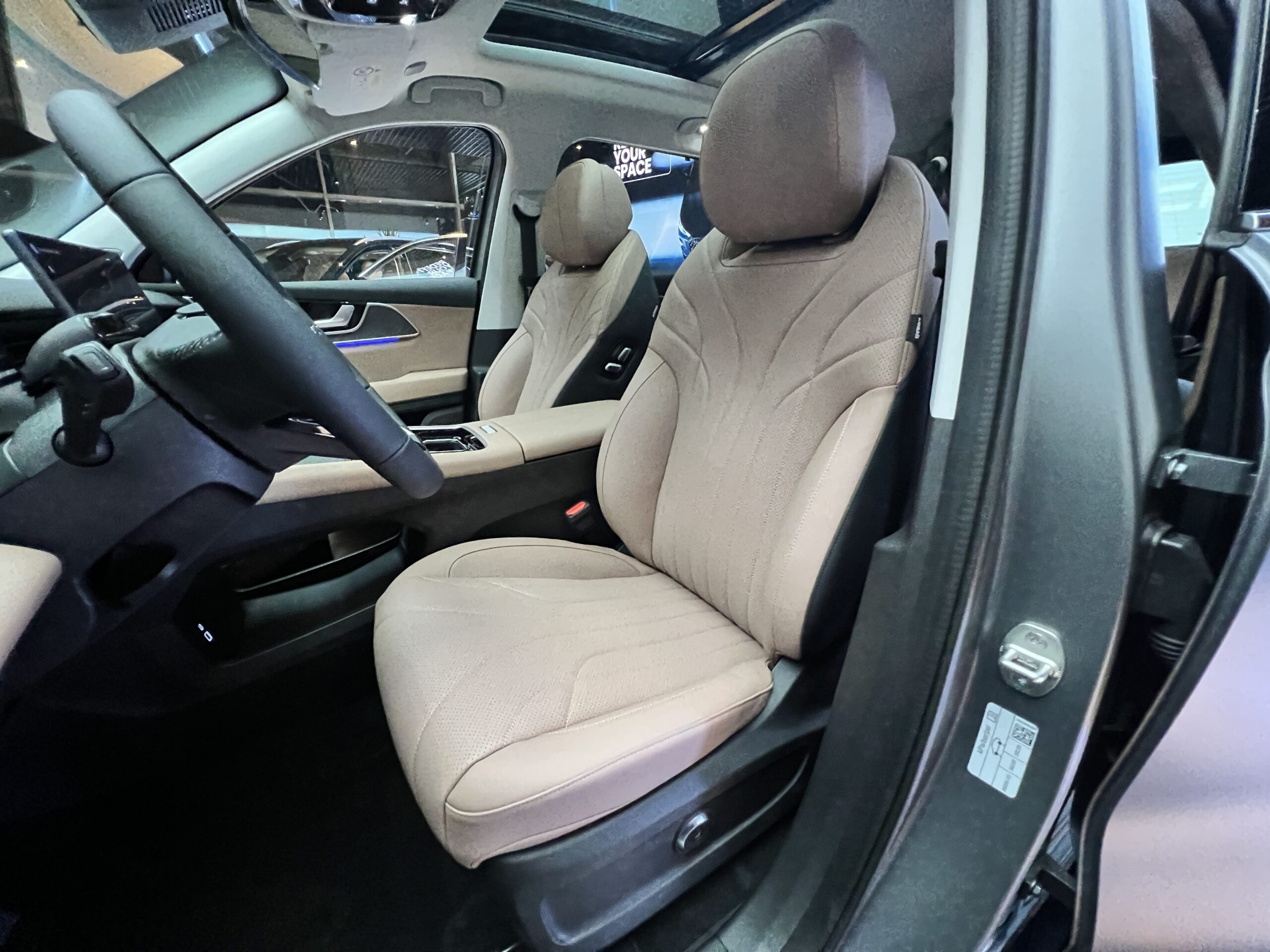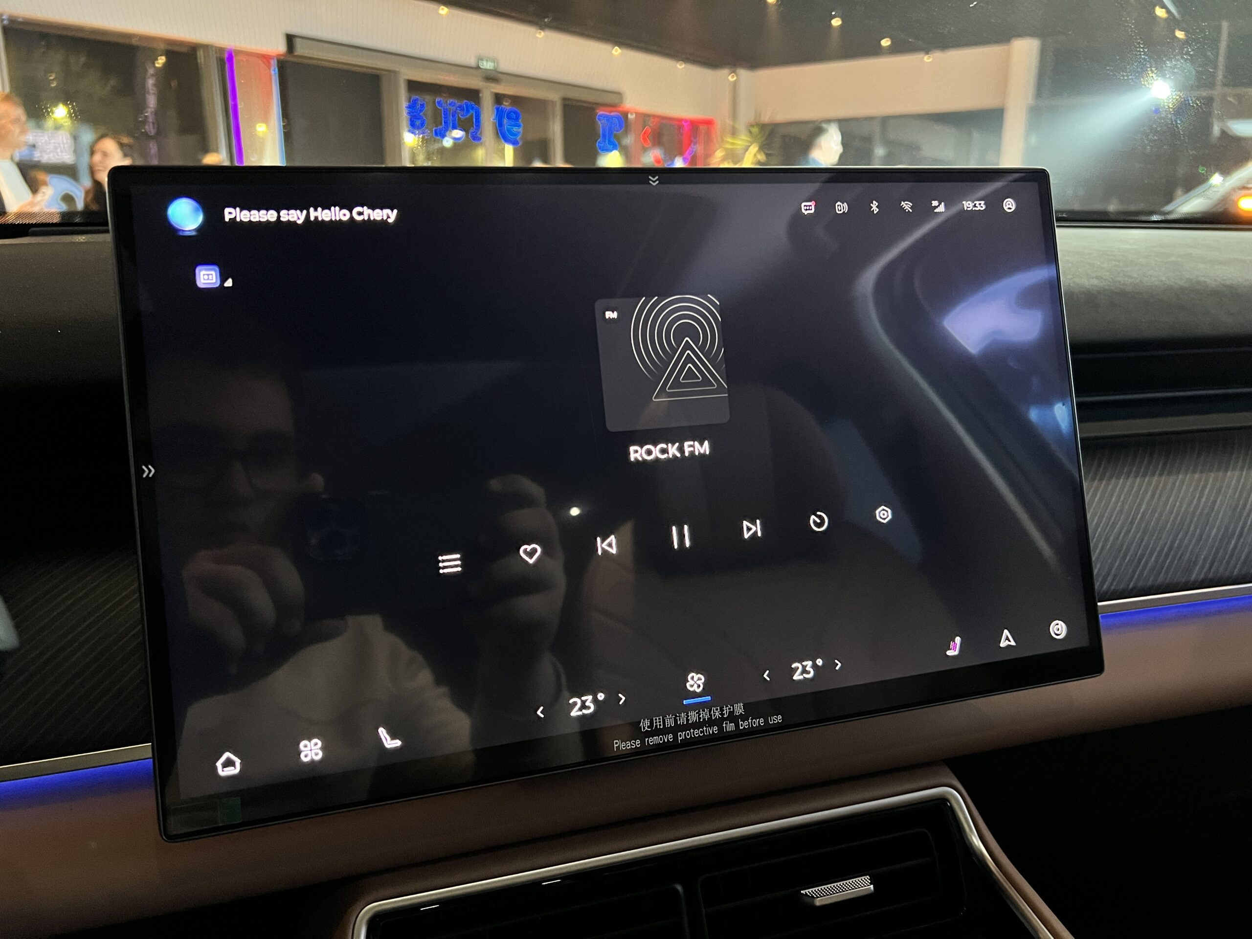 Spațiul este unul generos pentru ocupanții locurilor din față. Cei doi dispun de scaune din piele perforată care sunt reglabile electric. Ele pot fi încălzite, ventilate și pot oferi și masaj. Controalele pentru ele sunt prezente pe uși, ca la Mercedes-Benz, dar cel al pasagerului are funcționalități suplimentare. Acesta poate fi așezat ca un șezlong, Chery spunând că oferă pasagerului un nivel suplimentar de confort la drumurile lungi.