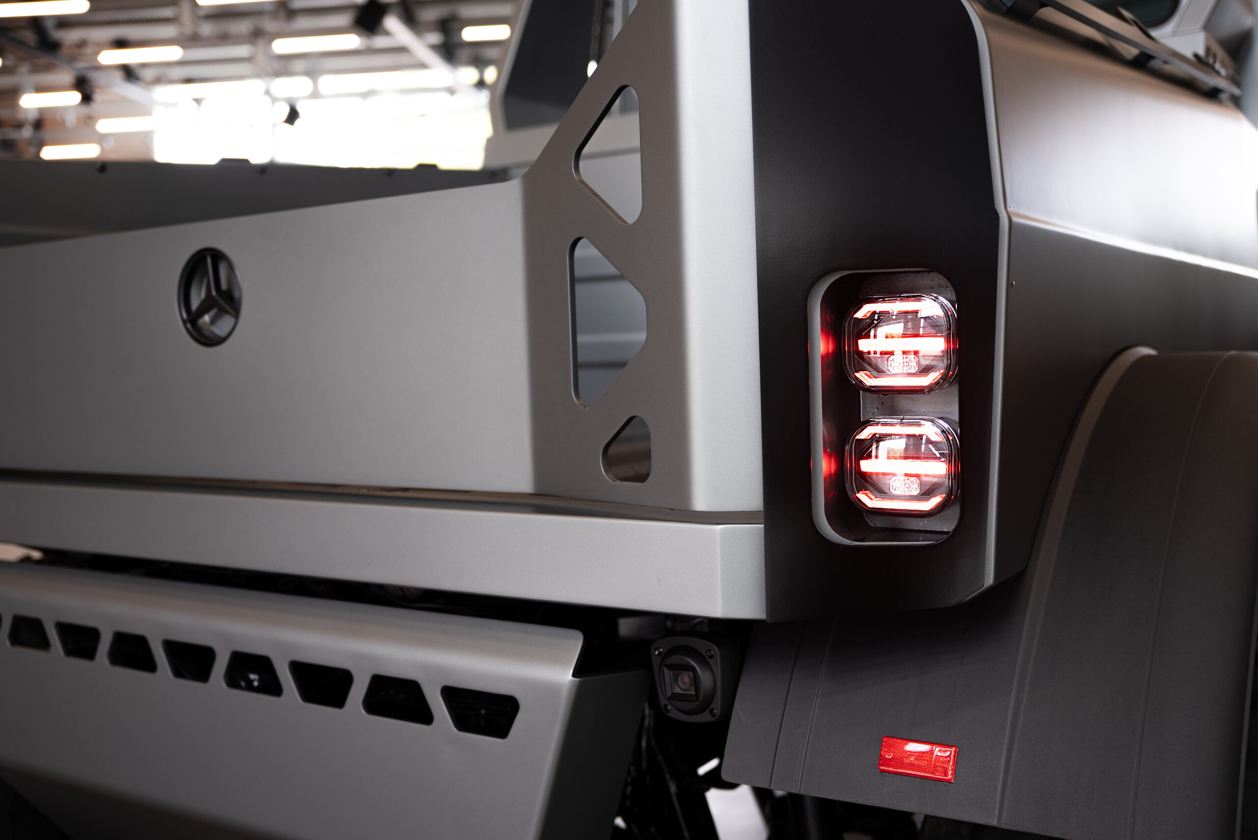 Exteriorul impresionant al Unimog este inspirat de SUV-uri și include vopsea gri mată, jante din aluminiu beadlock și un concept de iluminare distinctiv, cu faruri LED moderne.