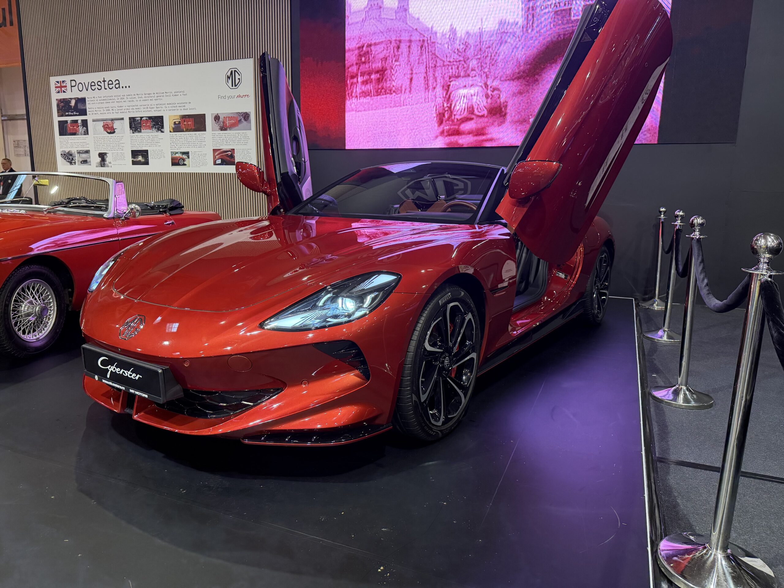 MG, deși are origini britanice (denumirea sa originală fiind Morris Garages), este deținută de compania de stat chineză SAIC, iar la standul lor de la Salonul Auto București a fost prezentată oferta lor, inclusiv roadster-ul Cyberster. Acesta a fost poziționat alături de un bătrân MG B, iar diferențele de mărime dintre ele nu sunt așa mari precum sugerează pozele.