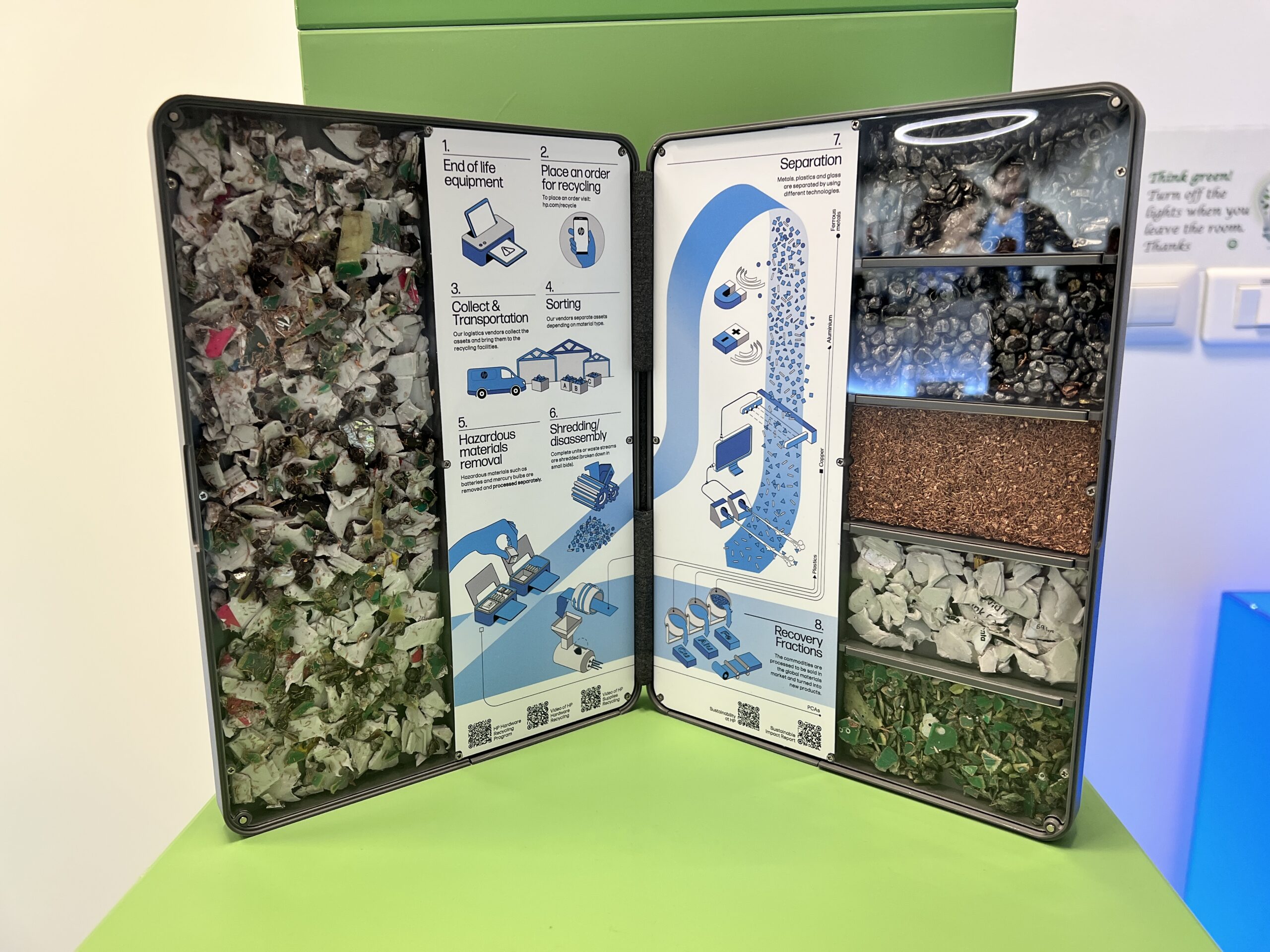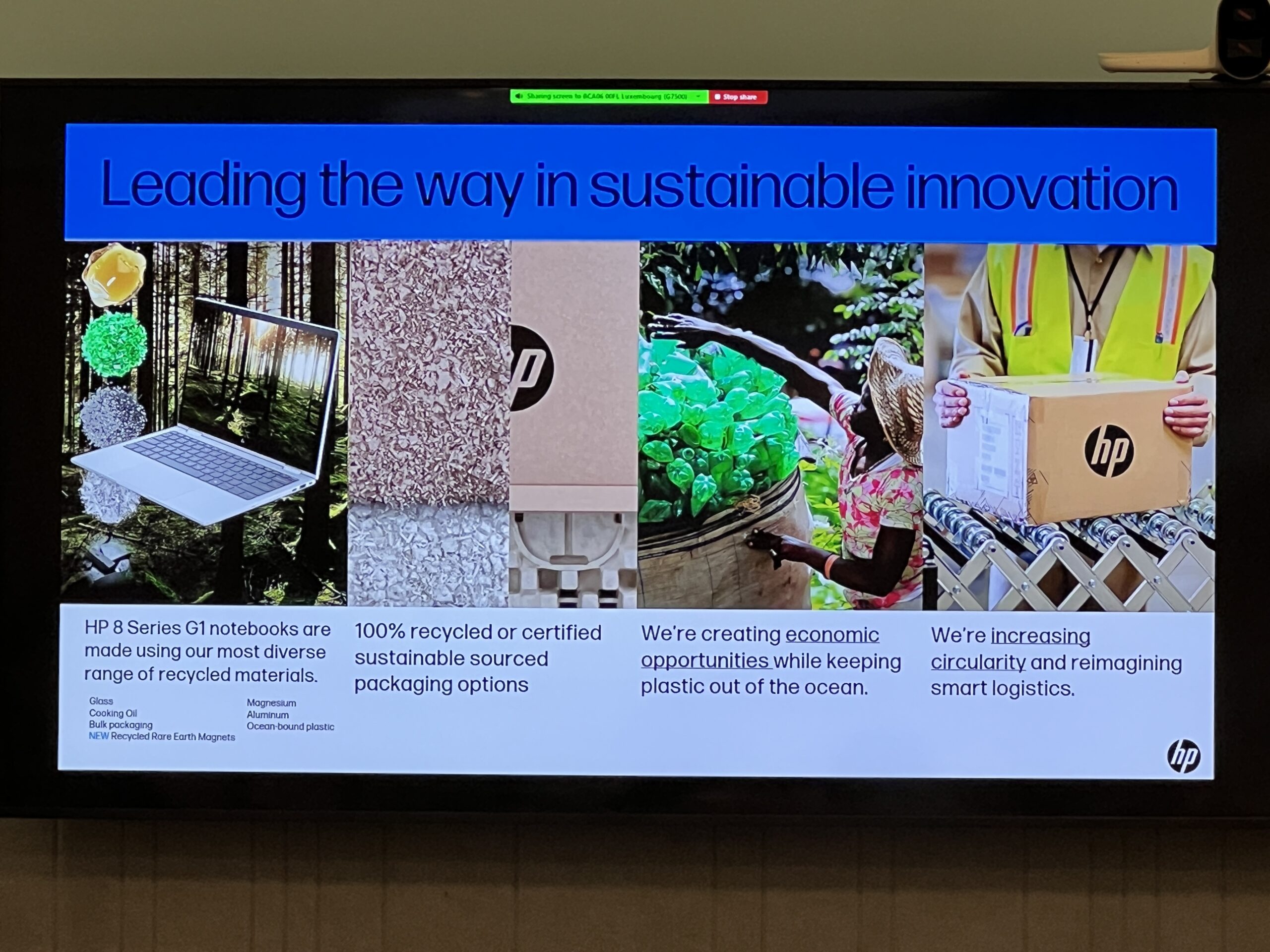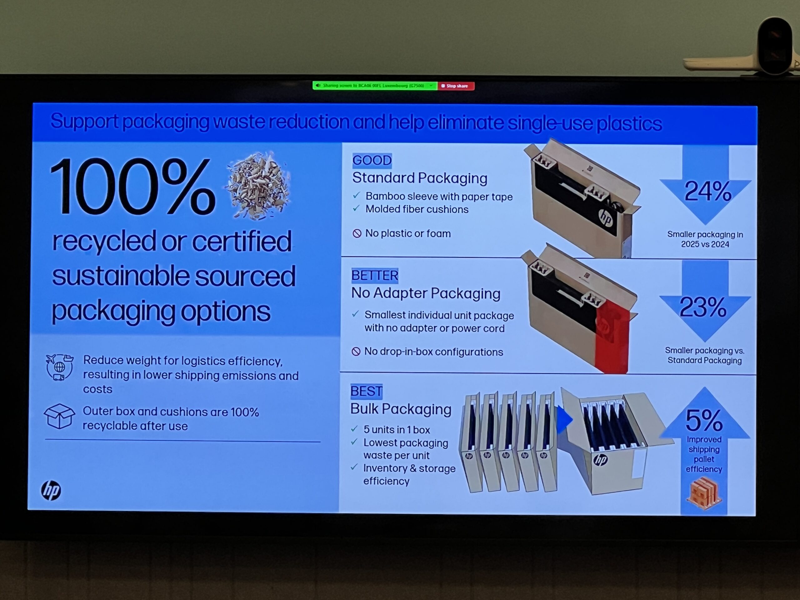 Eficientizarea nu vine doar pe partea de produse efective, ci și în ambalarea și distribuirea lor. HP susține că poate reduce cu până la 50% cutiile și elementele de protecție folosite în cutiile laptop-urilor, prin livrarea lor în sistem bulk. Totodată, ambalarea este realizată din materiale 100% reciclate sau sustenabile.