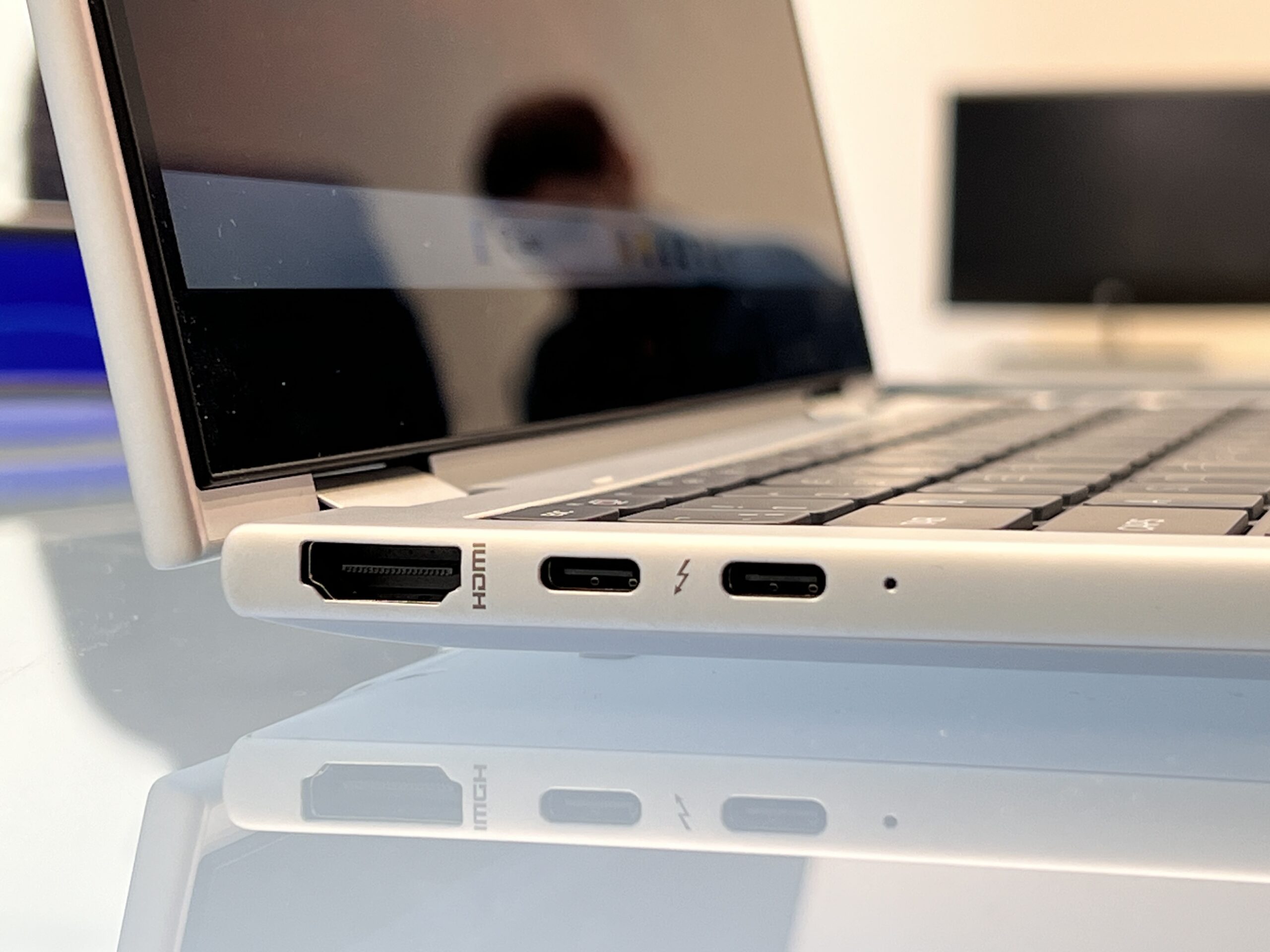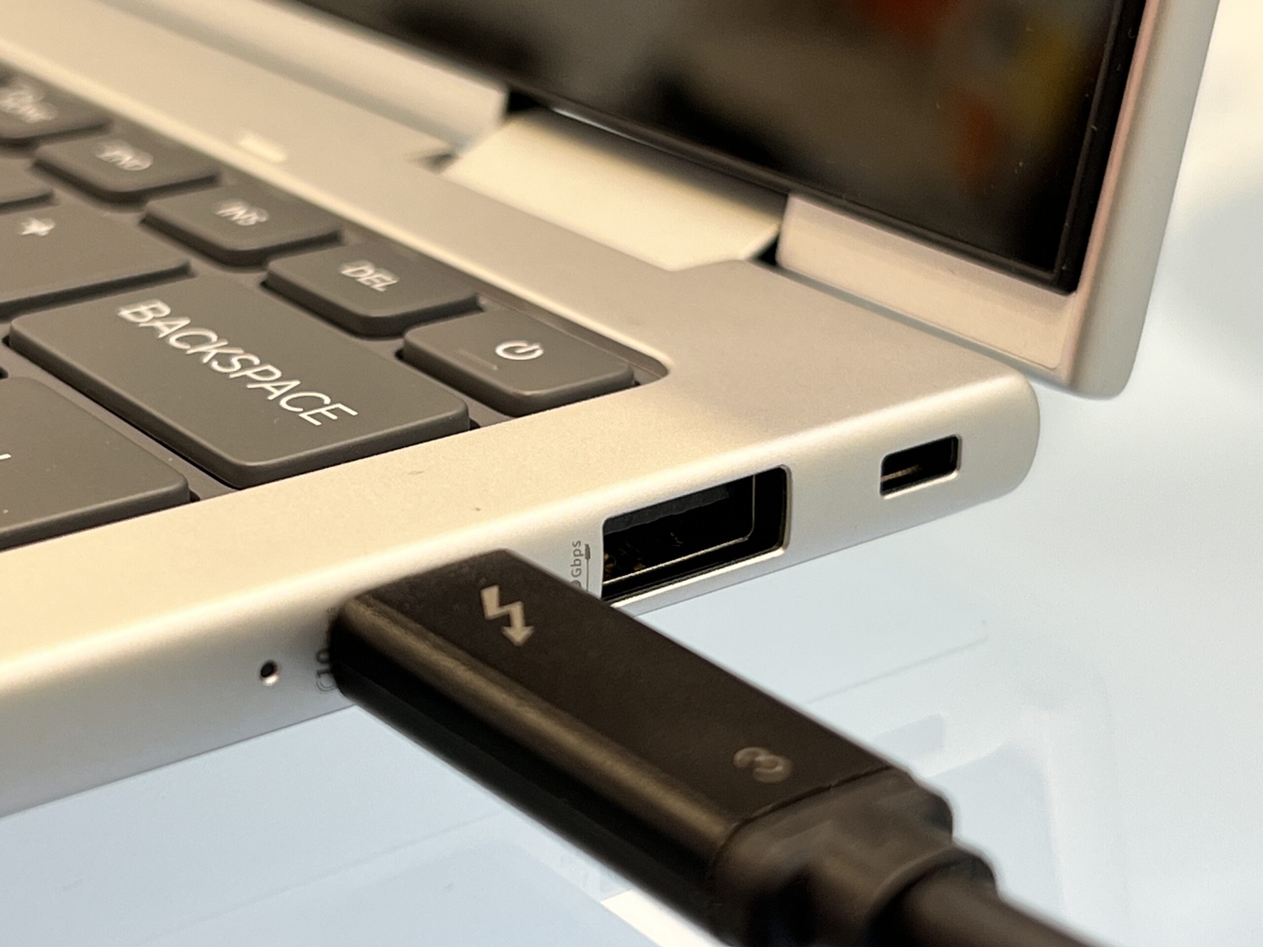 Pe partea de porturi, avem un HDMI 2.1, un port USB-A (de până la 10 Gbps), două Thunderbolt 4 (de până la 40 Gbps, cu Power Delivery și DisplayPort), un USB-C (de până la 10 Gbps, cu Power Delivery și DisplayPort) și mufă de căști de 3,5 mm.