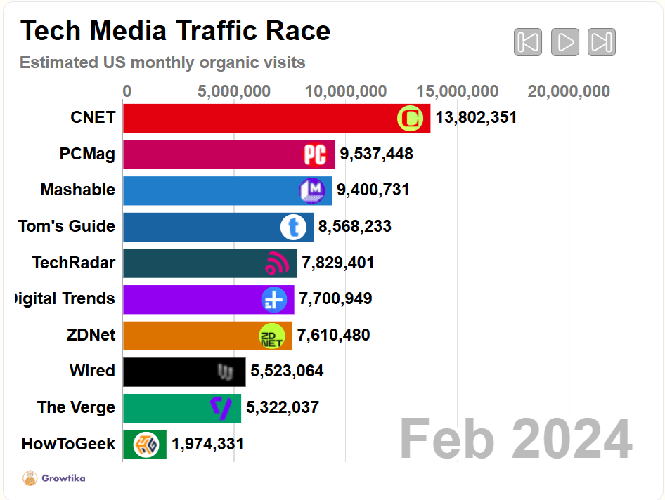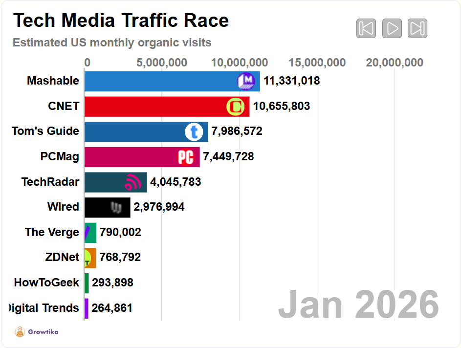 - Scăderi extreme (peste 80%) au fost înregistrate de Digital Trends (-97%), ZDNet (-90%), HowToGeek (-85%) și The Verge (-84%).