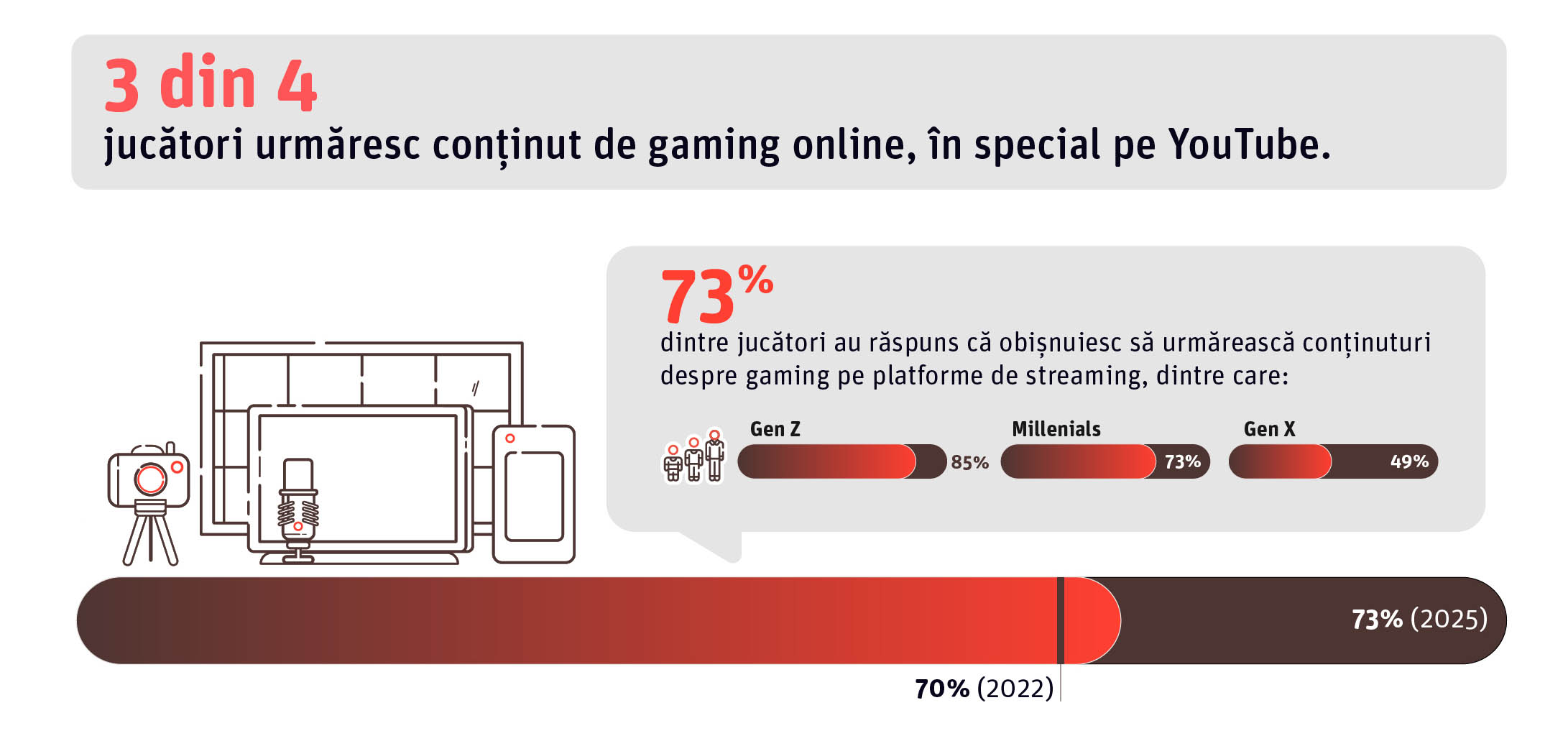 Consumul de conținut video este integrat în rutina gamerilor: 73% dintre jucători urmăresc zilnic clipuri sau transmisiuni despre jocuri, în special pe YouTube. Participarea la evenimente dedicate gamingului este și ea în creștere: o treime dintre respondenți au fost prezenți la evenimente precum East European Comic Con, Bucharest Gaming Week, Gaming Marathon sau Esports Kings. Organizatorii afirmă că aceste evenimente câștigă importanță, chiar dacă nu au devenit încă produse mainstream.