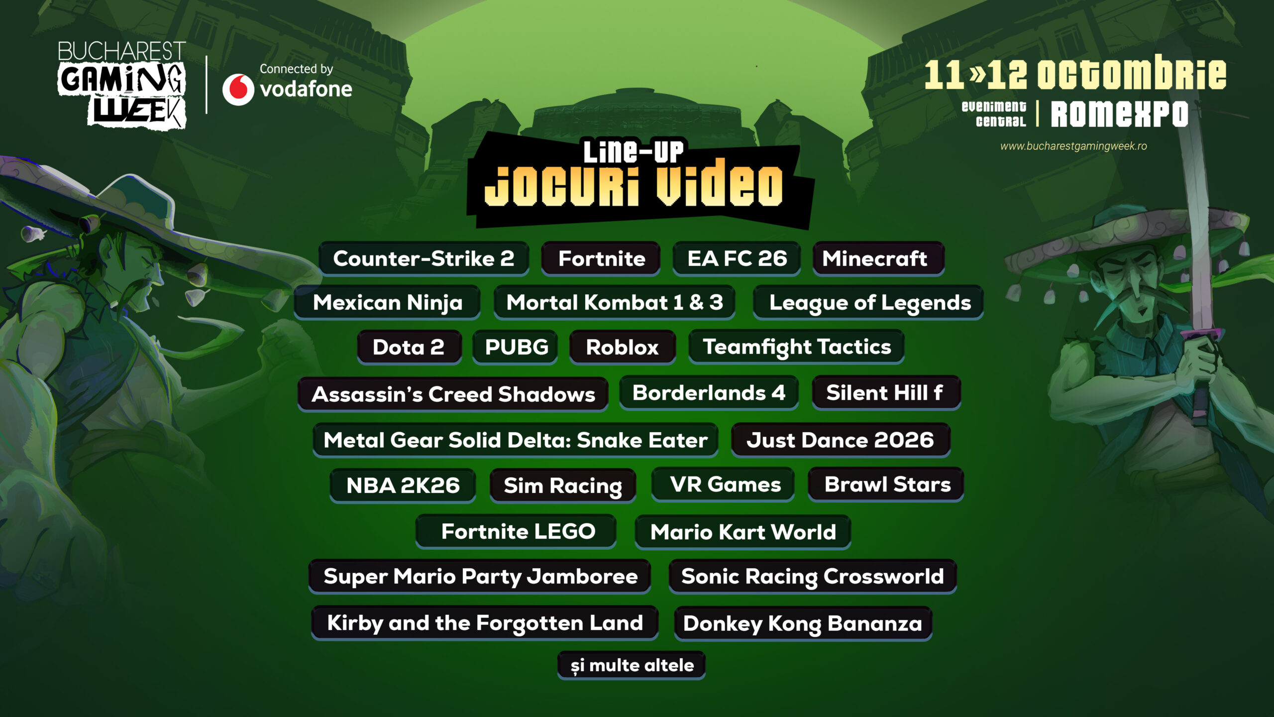 De-a lungul celor două zile, publicul își va putea demonstra skill-urile în Counter-Strike 2, Fortnite, Minecraft, Mortal Kombat, EA FC 26, Roblox, PUBG Mobile, LEGO Fortnite, Mario Kart și jocuri de sim racing. Cei de la Nintendo au pregătit surprize și sesiuni demo pentru cele mai noi titluri de pe Nintendo Switch 2, printre care Mario Kart World, Donkey Kong Bananza, Kirby și The Forgotten Land. La standul Amber, vizitatorii pot testa în premieră demo-ul Mexican Ninja, noul joc al studioului românesc aflat în producție. Jucătorii intră în rolul unui ninja mexican care își croiește drumul printr-o lume intensă și plină de provocări. Cei care avansează în joc pot câștiga controllere și alte periferice de gaming.