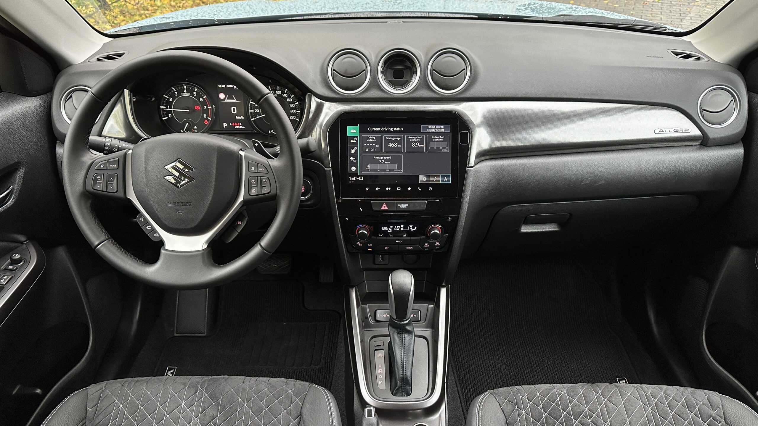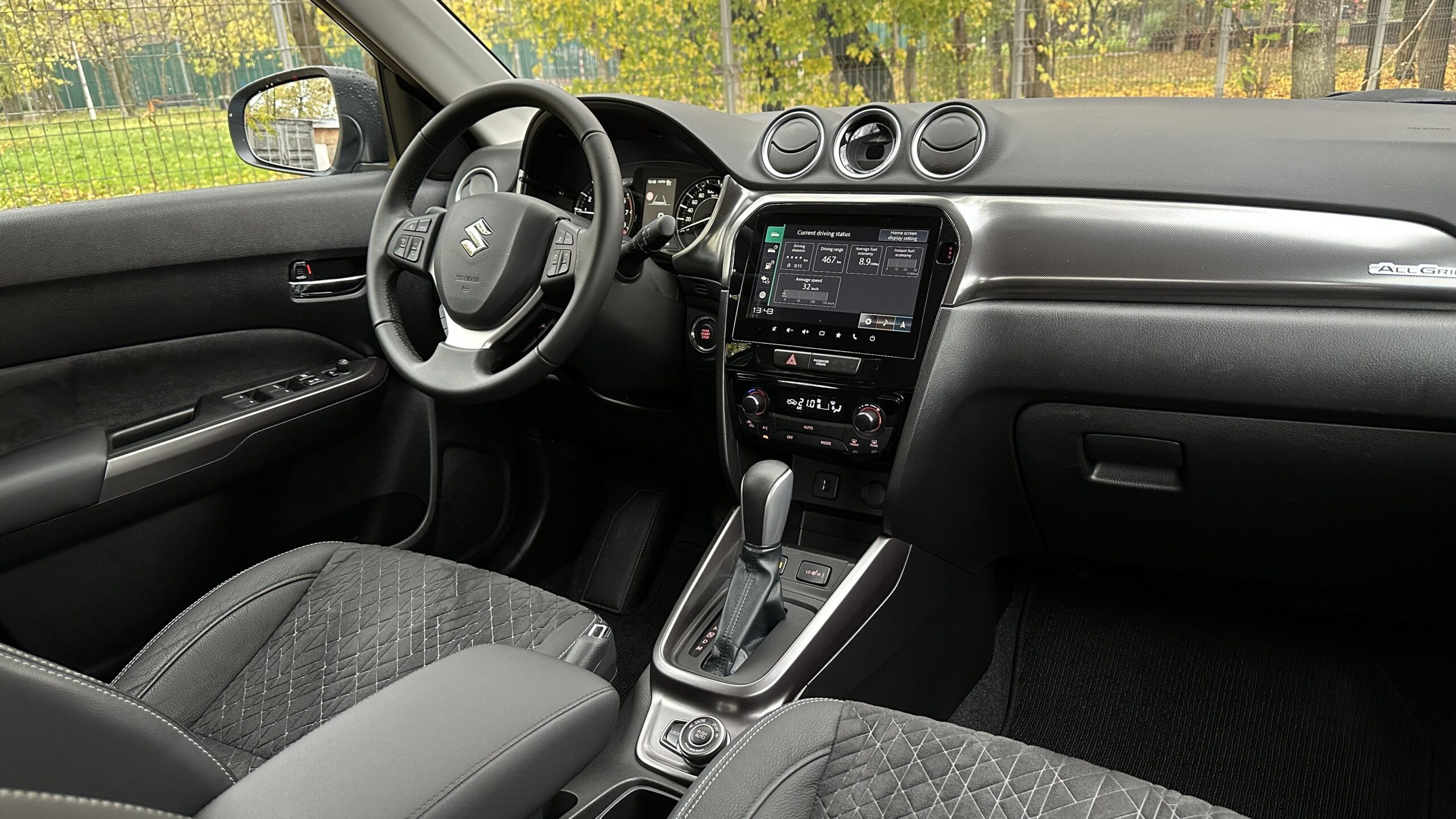 Funcționalitatea de bază se menține la nivel bun, cu comenzi fizice clare pentru climatizare, butoane intuitive pe volan, un port USB-A și o priză de 12 V, detalii simple, dar robuste. Există totuși un aspect care trădează cel mai evident conservatorismul interior: modul de accesare a informațiilor despre consum. Pentru a naviga prin aceste date trebuie utilizată o mică tijă rotativă amplasată direct în instrumentarul de bord, o soluție care pare desprinsă din altă epocă. La mulți rivali, aceeași funcție poate fi accesată direct de pe volan, într-un mod mult mai ergonomic, iar aici Vitara mai are încă de recuperat.
