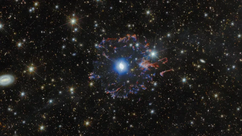 Hubble, în schimb, intră în detaliu. Cu ajutorul instrumentului Advanced Camera for Surveys, telescopul a capturat regiunea centrală extrem de luminoasă, unde o stea deja „moartă”, dar încă strălucitoare, este înconjurată de bule albe și bucle albastre de gaz. Imaginea scoate la iveală o complexitate impresionantă – straturi, filamente și structuri delicate, greu de observat anterior.