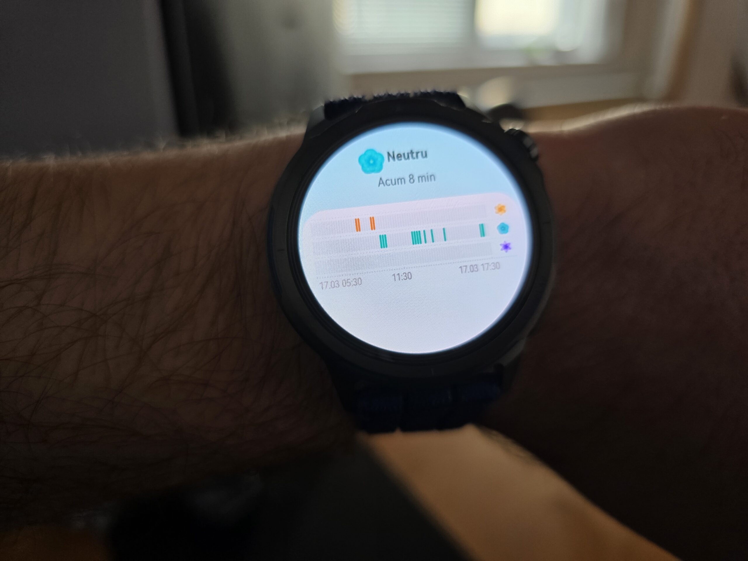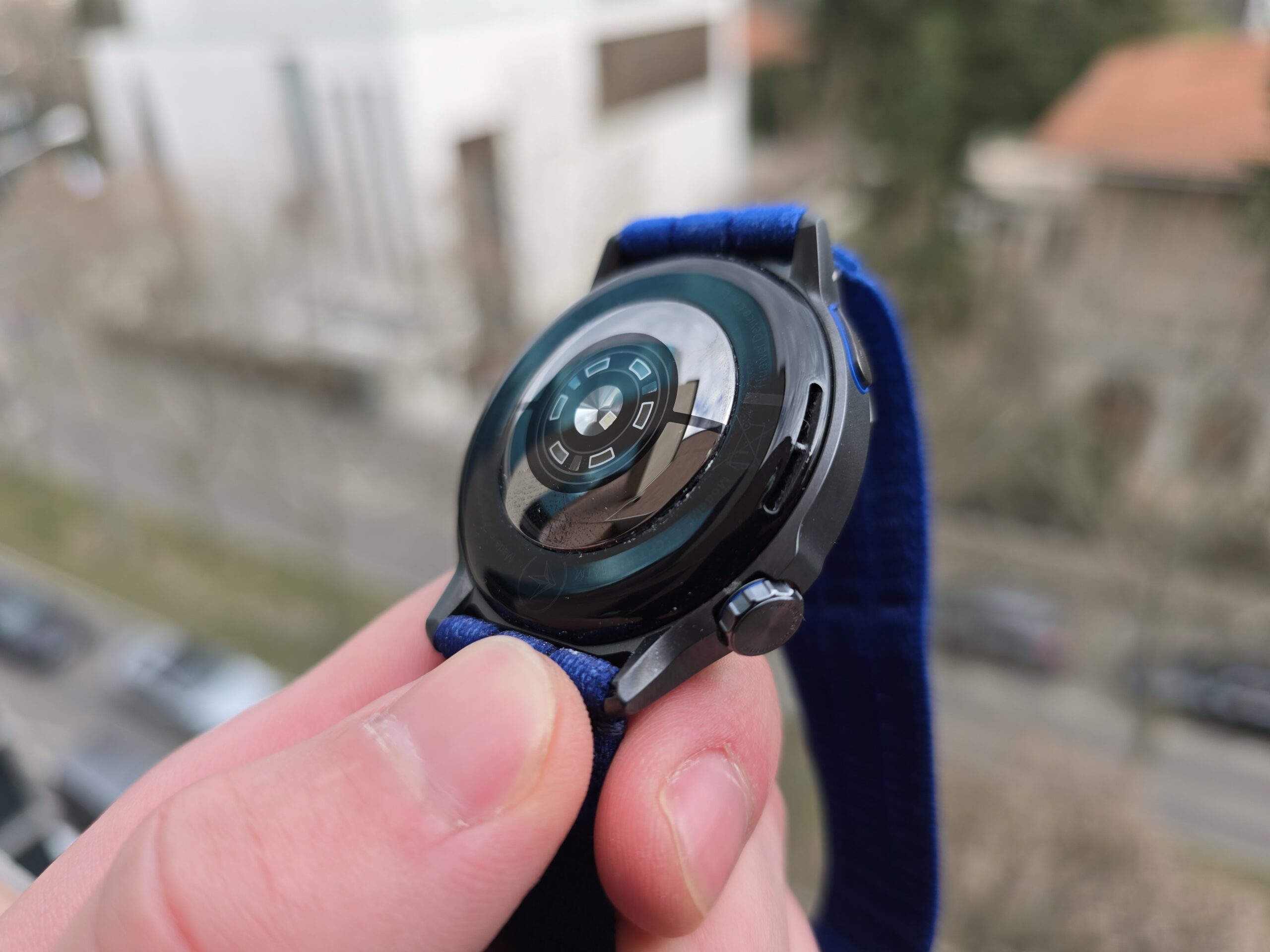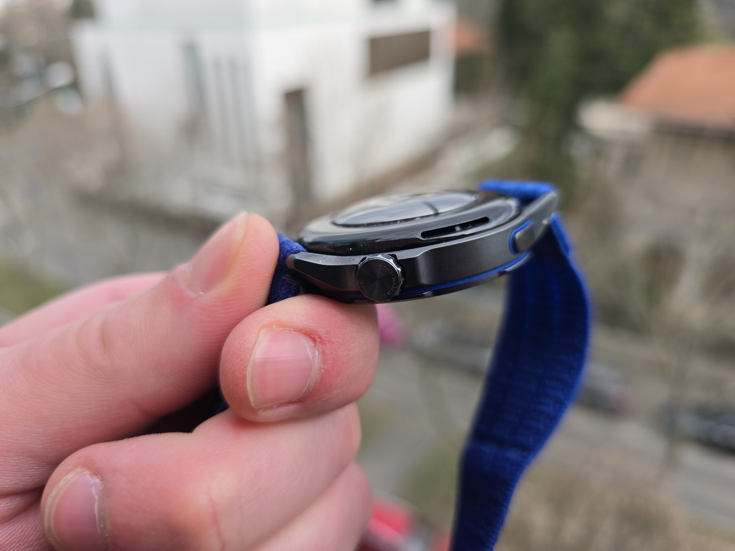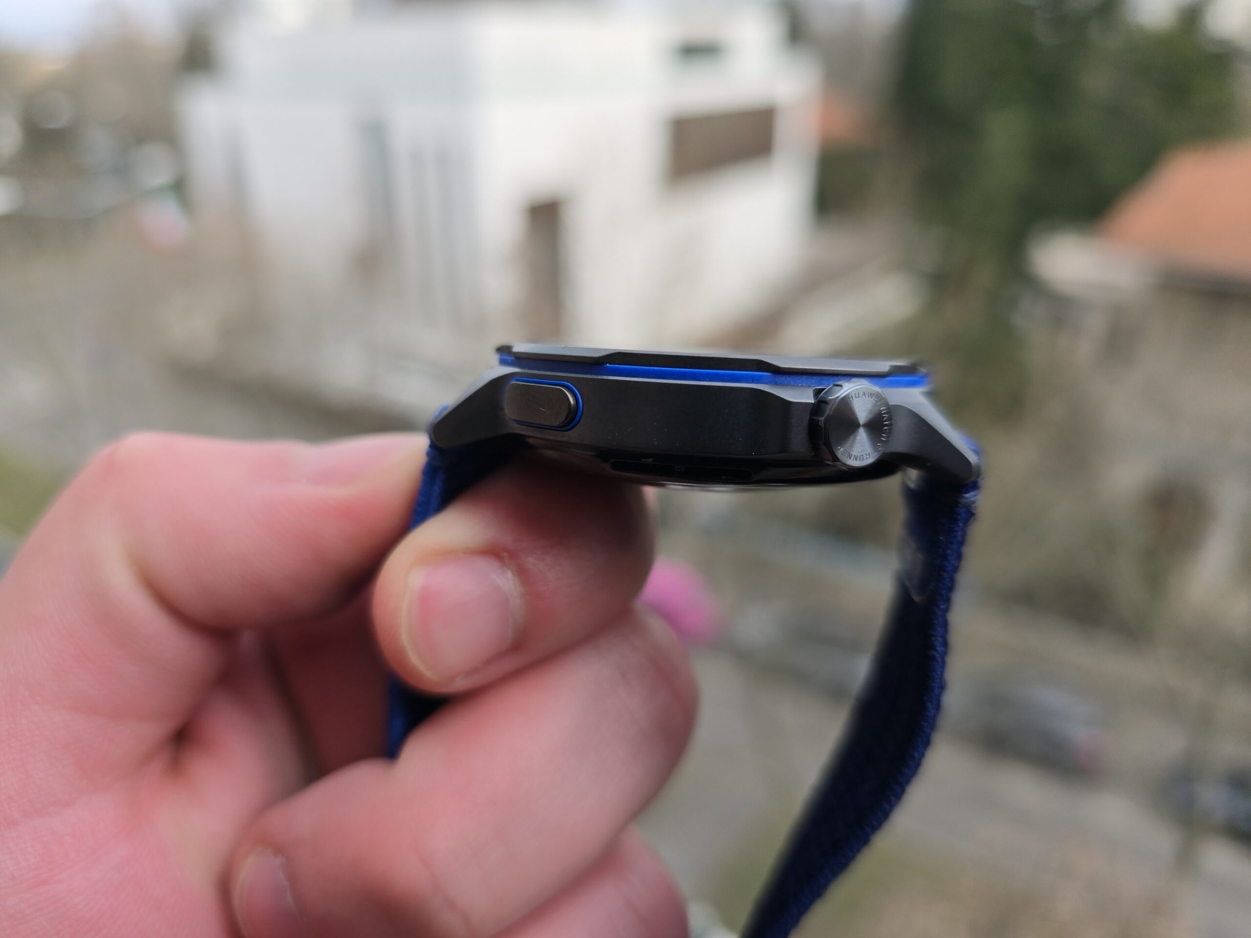 Un detaliu care pe care l-am apreciat imediat este poziționarea coroanei rotative. Dacă la alte modele de smartwatch-uri m-am lovit adesea de problema apăsării accidentale cu încheietura în timpul exercițiilor, aici designul protejează coroana.