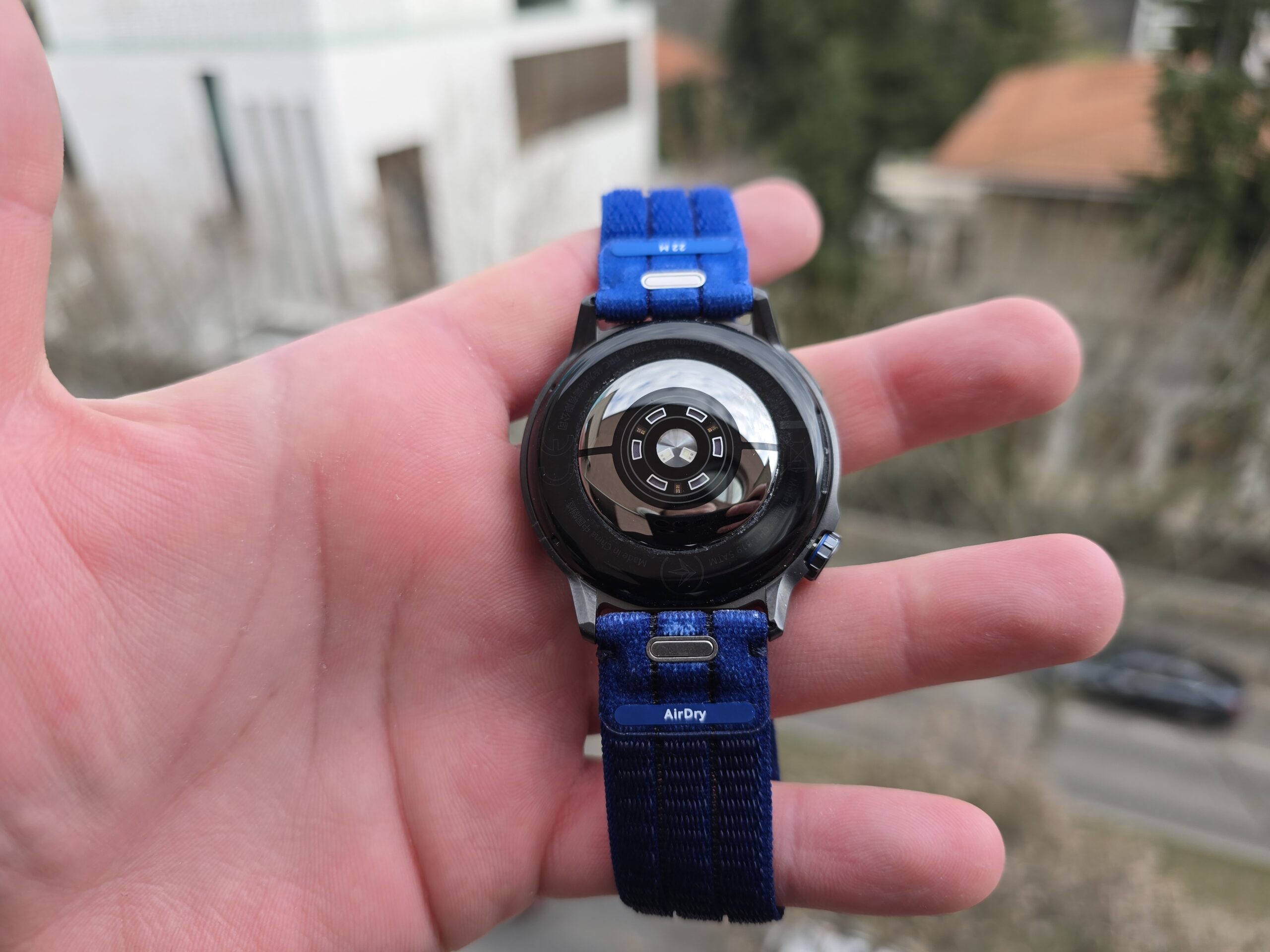 Cureaua este foarte bine ventilată și rămâne confortabilă în condiții de efort intens. Este genul de detaliu pe care îl ignori pe hârtie, dar îl apreciezi după primele antrenamente serioase. În plus, sistemul de eliberare al curelei este proiectat destul de smart și permite schimbarea acestuia cu ușurință. Nu mai simți că te lupți cu acei pini minusculi.