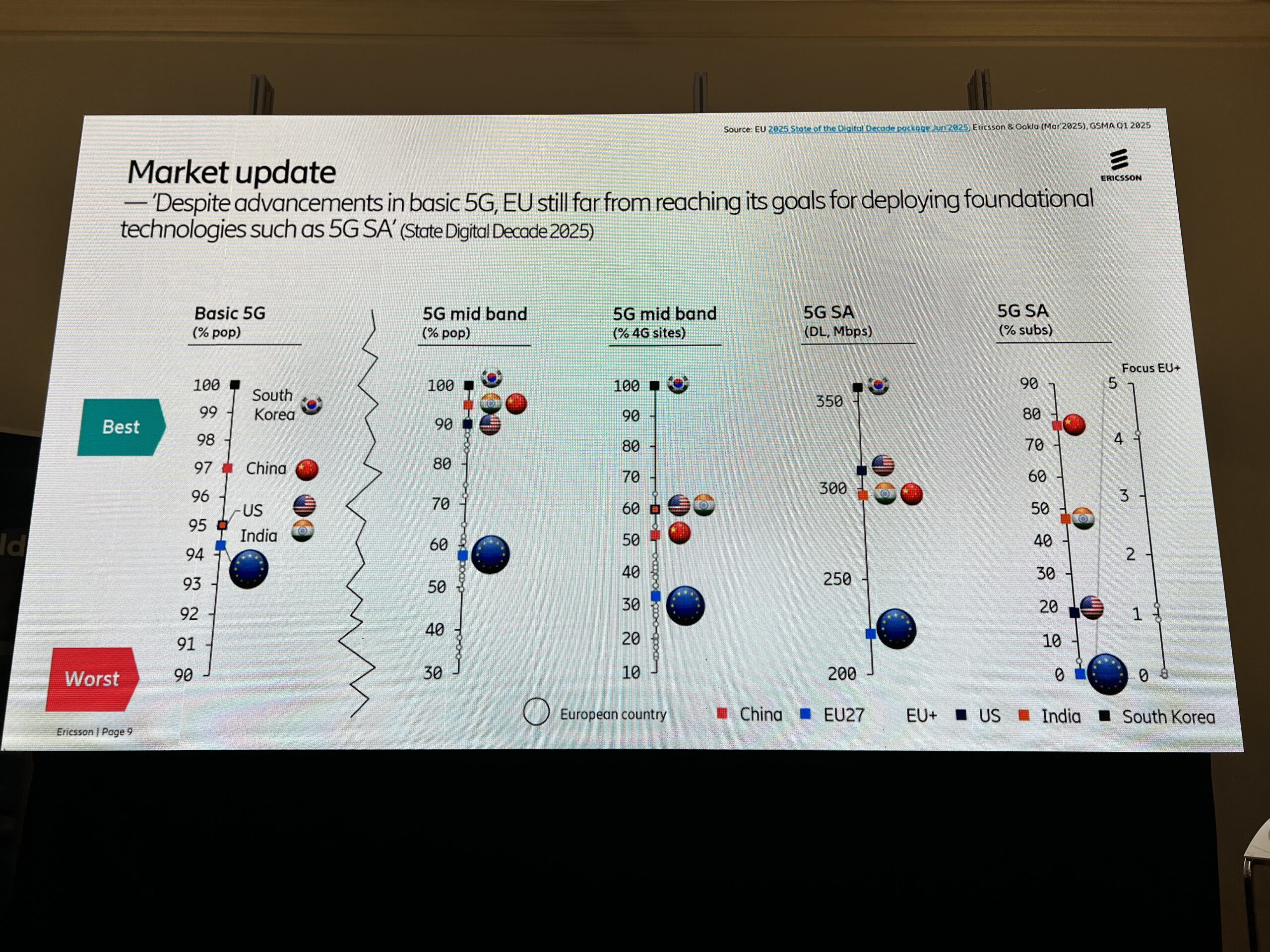 Europa merge, în mare, pe o infrastructură 5G NSA (94%), cu doar anumite zone având o infrastructură dedicată pentru tehnologia de înaltă viteză. În comparație, India a ajuns la o infrastructură standalone de 5G în doar 18 luni și cu o arie de acoperire de 65%, iar SUA stă la aproximativ 20%.