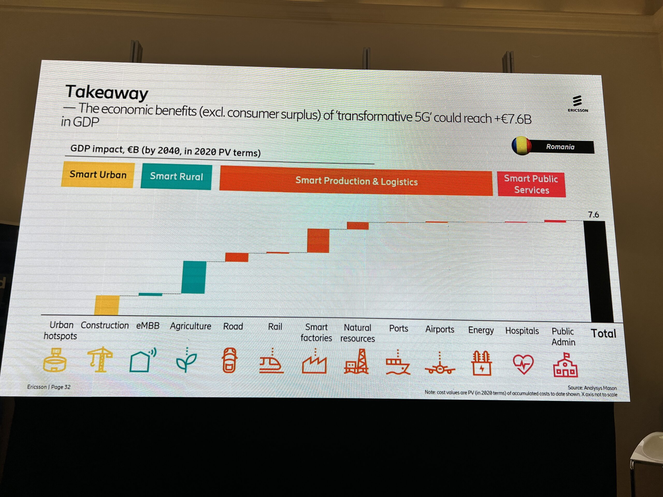 Directorul din cadrul Ericsson a spus că, în România, putem aduce la PIB 7,6 miliarde de euro prin implementarea unei tehnologii 5G dedicate. Sectoarele care vor beneficia în special de această tehnologie ar fi construcțiile, agricultura și fabricile inteligente. De asemenea, nu este de ignorat sectorul transporturilor rutiere și feroviare, porturile, aeroporturile și administrația publică.