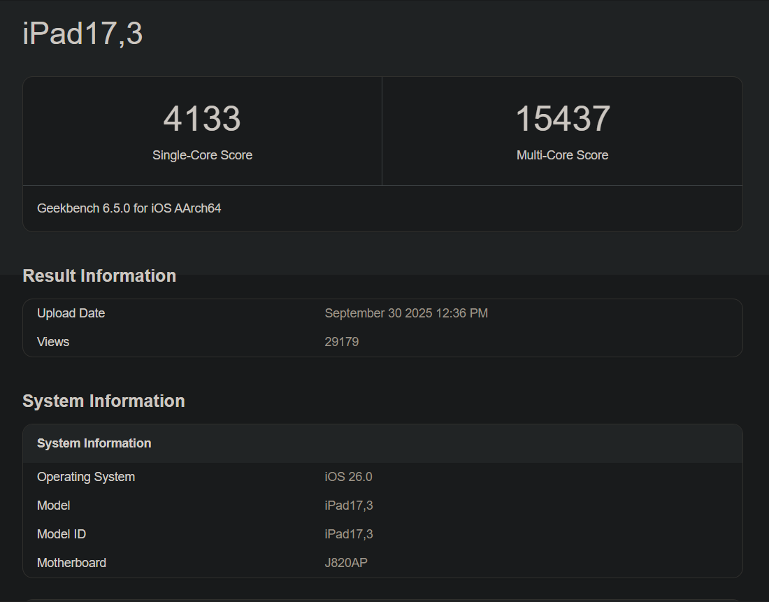 Rezultatul benchmark-ului a arătat, de asemenea, că iPad Pro cu 256 GB de stocare va avea 12 GB de RAM, la fel ca iPhone Air, iPhone 17 Pro și iPhone 17 Pro Max. Modelele iPad Pro cu cipul M4 au doar 8 GB de RAM atunci când sunt echipate cu 256 GB sau 512 GB de stocare, dar modelele cu 1 TB sau 2 TB de stocare sunt echipate cu 16 GB de RAM.